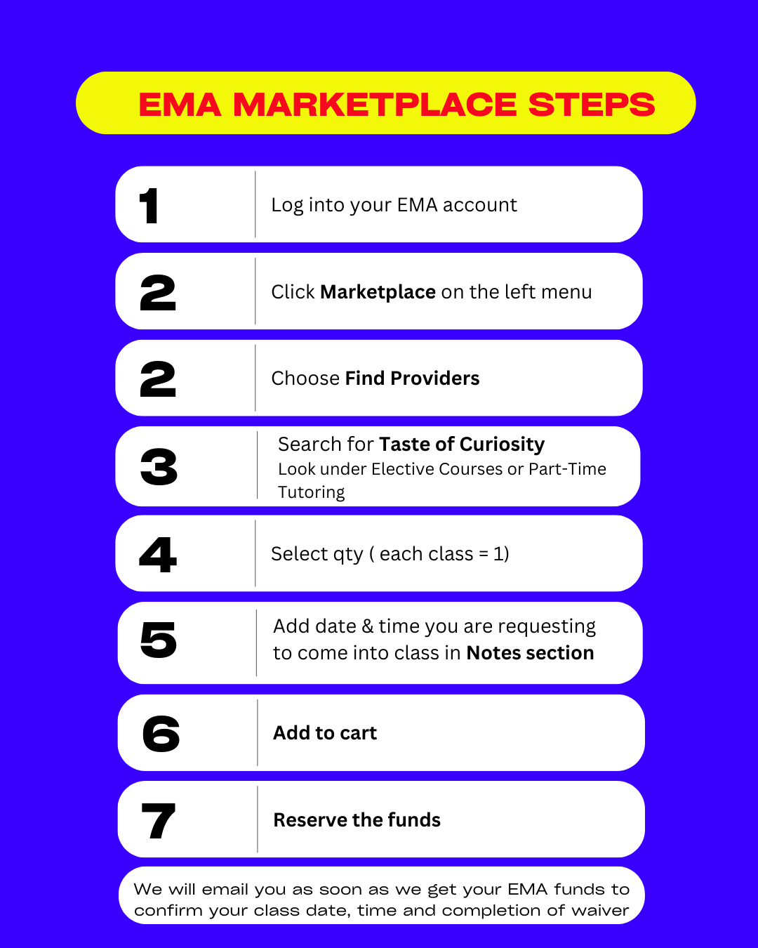 Follow these steps in your EMA Marketplace account to reserve your class. If you have any questions about any class please reach out via email tastecuriosity@gmail.com or by phone 201-936-4539. We are happy to help make your experience as seamless as possible.