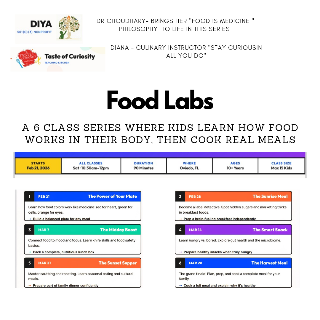Bringing the " Food is Medicine philosophy to Orlando families. Join Dr. Choudhary and Culinary Director Diana for a 6 week class series and leave with an abundance of food knowledge.